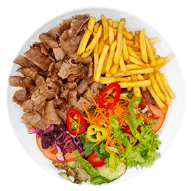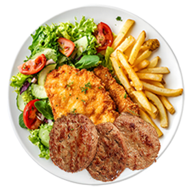Servie avec des frites ou des potatoes accompagnée d'une salade.