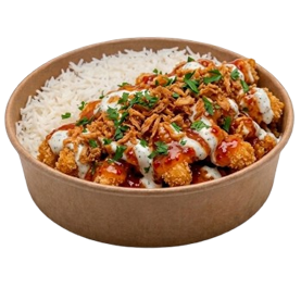 Riz thaï parfumé, sauce crousty maison, poulet croustillant, oignons crispy, sauce sucrée salée, sauce tandoori.