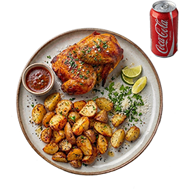 1 Poulet braisé + 2 Accompagnements au choix + 2 Boissons au choix + Sauce verte maison.