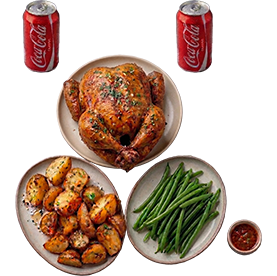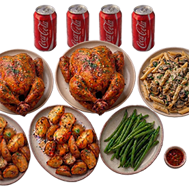 2 Poulets braisés + 4 Accompagnements au choix + 4 Boissons 33cl au choix + Sauce verte maison.
