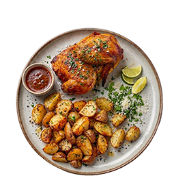 1/2 Poulet braisé + 1 Accompagnement au choix + 1 Boisson 33cl au choix + Sauce verte maison.
