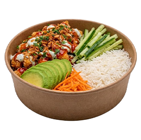 Riz thaï parfumé, sauce crousty maison, poulet croustillant, oignons crispy, sauce sucrée salée, sauce tandoori.
