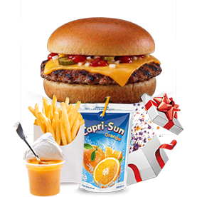 1 Cheese burger + 1 Portion de frites + Eau ou caprisun + Compote + 1 jouet surprise.