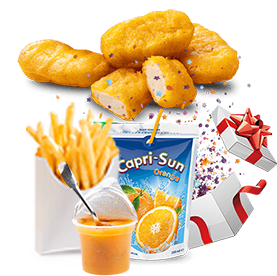 4 Nuggets + 1 Portion de frites + Eau ou capri sun + Compote + 1 jouet surprise.